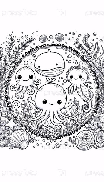 A kawaii ocean creatures цветная страница в круговом формате, Ai generated image