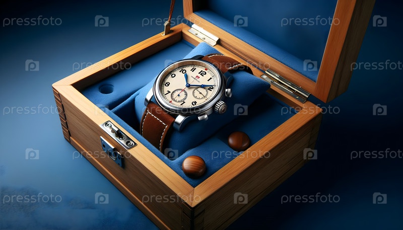 Швейцарские часы в деревянном витрине, изображение создано AI