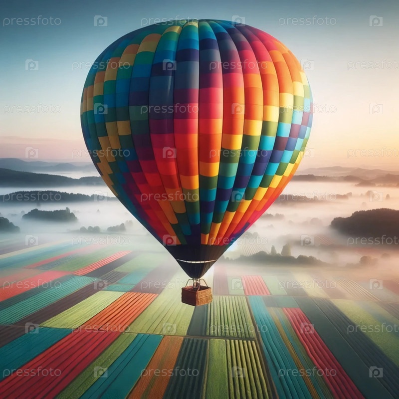 Балон с горячим воздухом, дрейфующий вблизи облаков на рассвете, Ai generated image