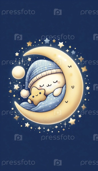Сонная кавайская луна с ночной чашечкой, Ai generated image