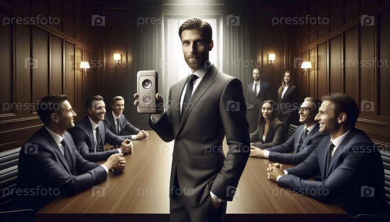 Уверенный бизнесмен в стройном костюме, демонстрирующий новую офисную диктантную машину с нажатием кнопки своим впечатленным коллегам, Ай создал образ