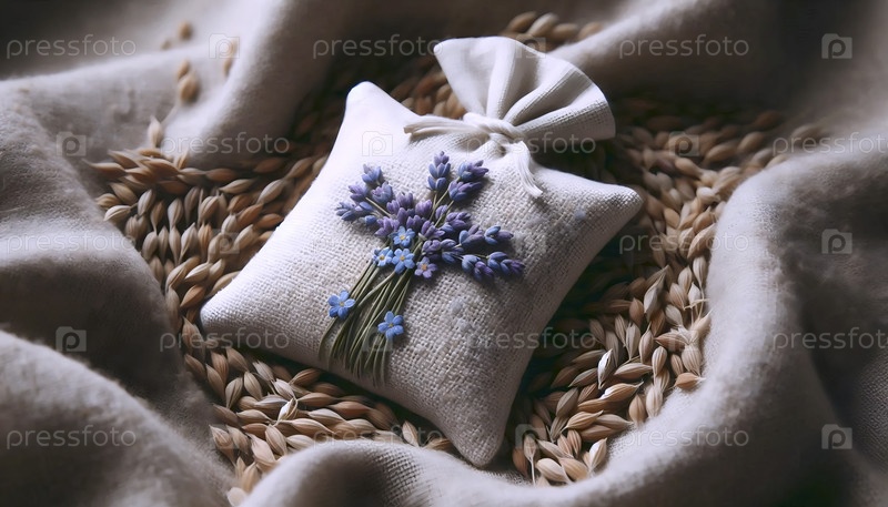 Лавандовый мешок с прессованным цветочным крестом на льне, Ai generated image