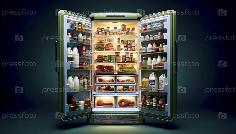 Блестящий, авокадо-зеленый холодильник с идеально организованными красочными упаковками продуктов питания и напитков Ai создал изображение
