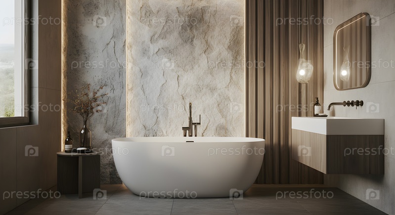 Минималистическая ванная комната со свободно стоящей ванной, изображение создано с помощью Ai
