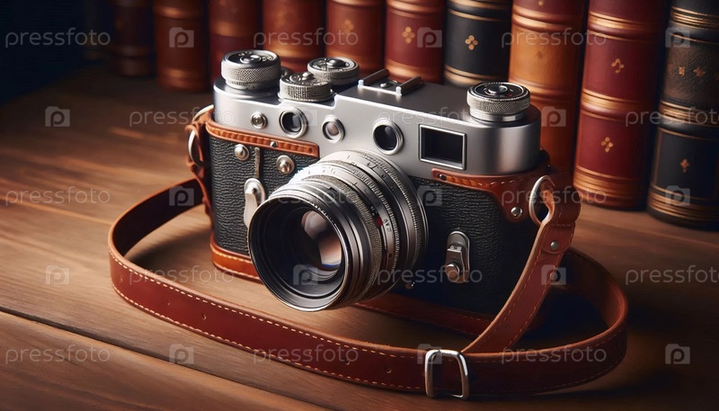 Винтажная пленочная камера на книжной полке, Ai generated image