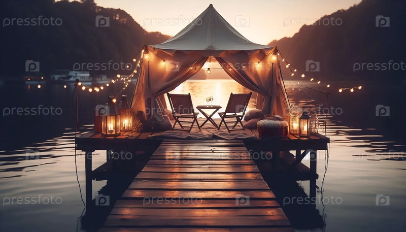 Сцена старинного кемпинга на берегу озера, Ai generated image