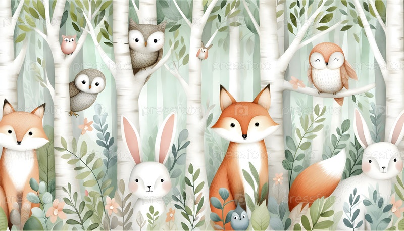 Причудливая акварель леса детская комната обои с дружелюбными животными - лисы, кролики и совы, Ai created image