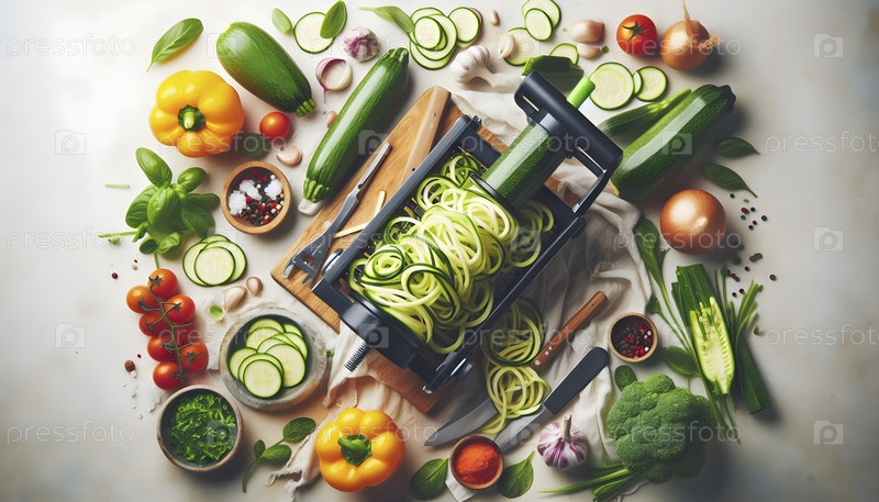 Над головой фотография красочного овощного спирализатора, создающего лапшу из цуккини, Ai created image