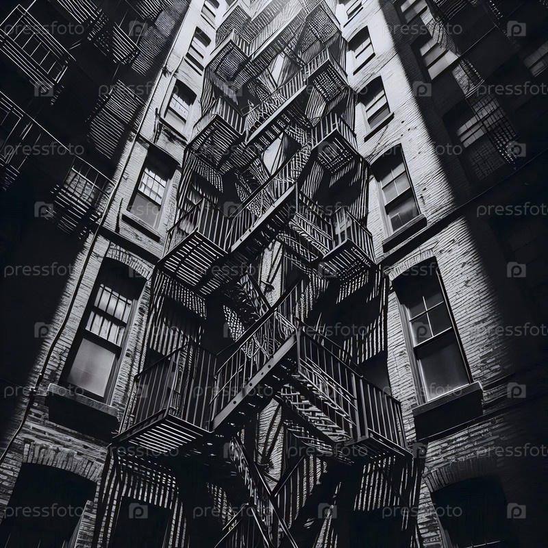 Абстрактные геометрические узоры теней, брошенных пожарной лестницей на строгую кирпичную стену, Ai generated image