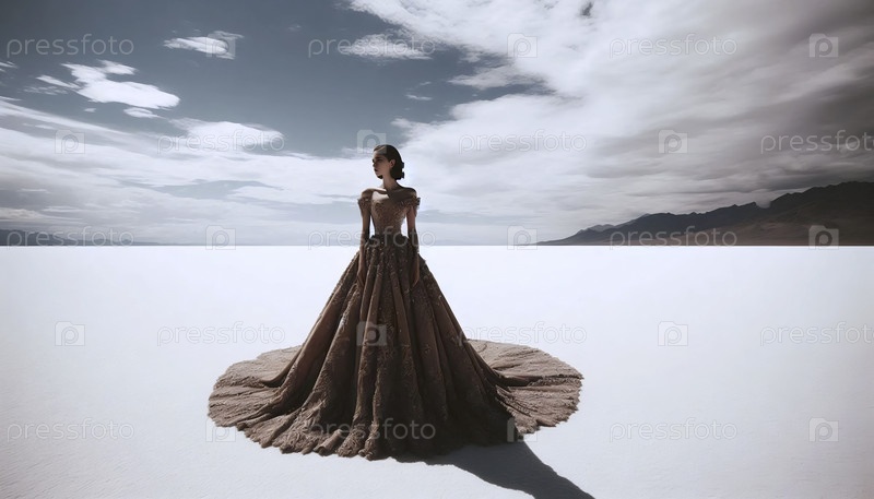 Модная модель в изысканном, текстурированном платье стоит в сюрреалистическом ландшафте белой соляной равнины под обширным, капризным небом