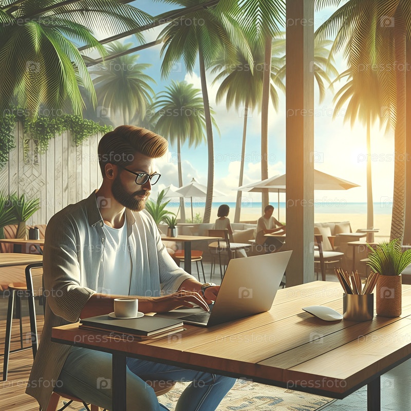 Фрилансер работает на ноутбуке в тропическом коворкинг-пространстве, пальмы на заднем плане