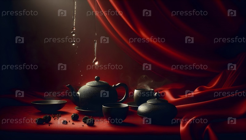 Черный чай с лаком на красном шелковом фоне, Ai created image