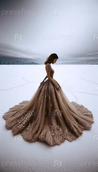 Модная модель в изысканном, текстурированном платье стоит в сюрреалистическом ландшафте белой соляной равнины под обширным, капризным небом
