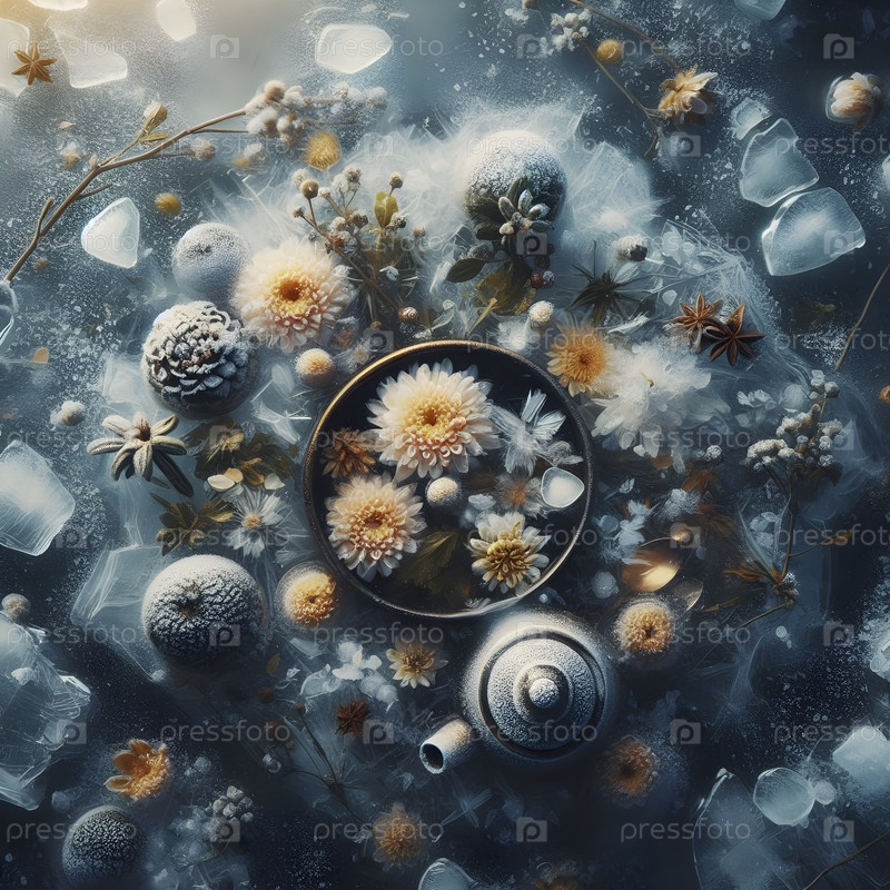Озеро замороженного чая с встроенными цветами хризантемы, Ai created image