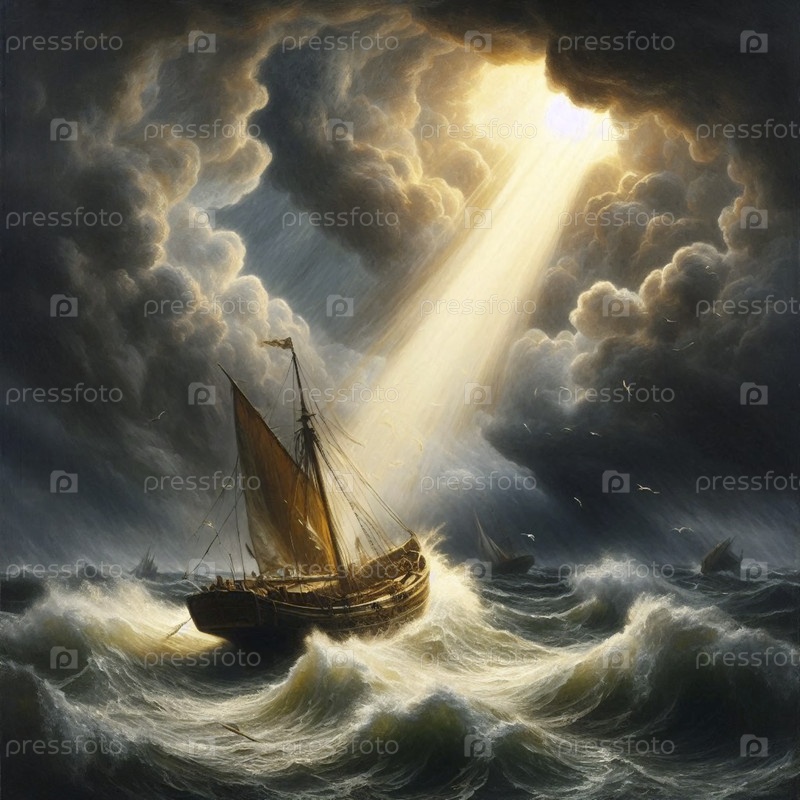 Небольшая лодка в шторме, свет с неба, романтическая гавань для яхт, Ai generated image