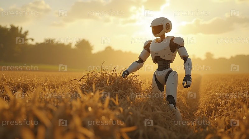 Роботизированный фермер, собирающий урожай в футуристическом поле, Ai generated image