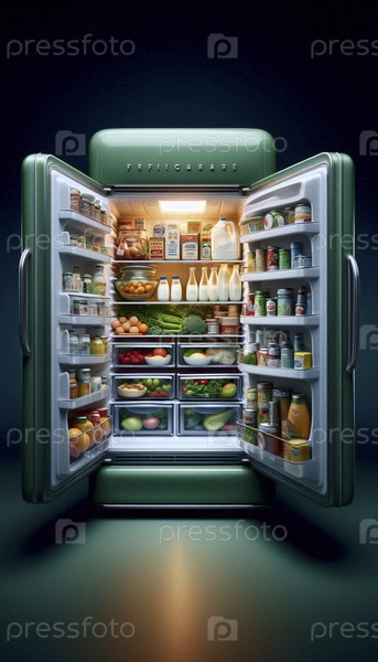 Блестящий, авокадо-зеленый холодильник с идеально организованными красочными упаковками продуктов питания и напитков Ai создал изображение