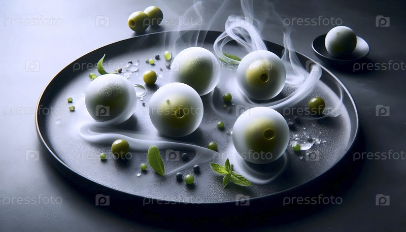 Молекулярное гастрономическое искусство, показывающее сферические оливки и замороженные дымящиеся травы на гладкой современной тарелке, Ai created image