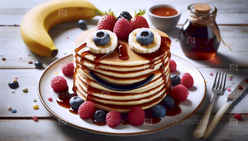 Причудливый стек блинов, украшенный ягодными лицами и улыбками на кусочках бананов, посыпанный сиропом в художественных узорах, Ai created image