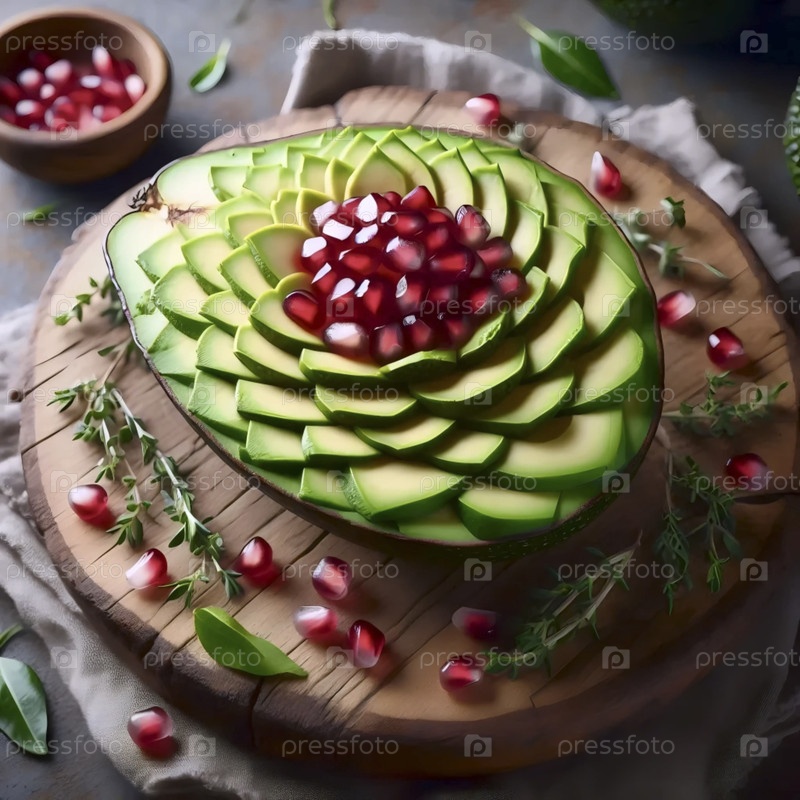 Авокадо, наполовину вырезанное в сложный цветочный дизайн с семенами граната как центром, Ai created image