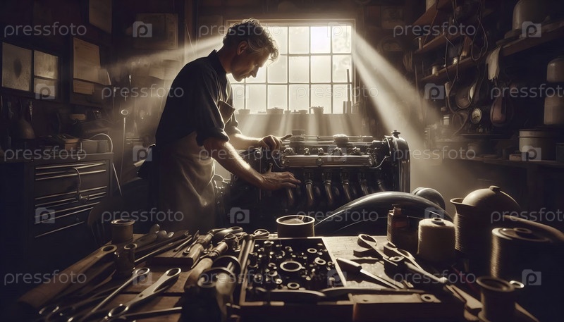 Механик, работающий под поднятым капотом классического автомобиля в пыльном солнечном гараже с разбросанными инструментами и лучами света, прорезающими воздух, создал изображение Ай