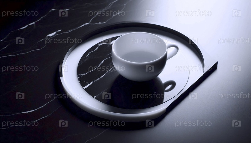 Продуктовый снимок минималистической фарфоровой чайной чашки на поверхности черного мрамора, сосредоточьтесь на идеальном обочине и ручке, Ai generated image