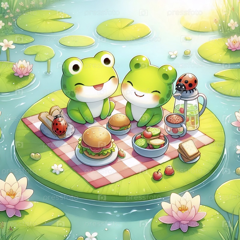 Кавайская сцена пикника на лилии, Ai generated image