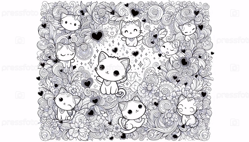 Красочная страница кавайи с волшебными кошками и вихрями, Ai generated image