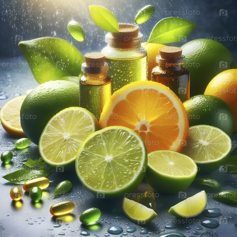 Сочные цитрусовые фрукты, нарезанные пополам с бутылками витаминов, концепция витамина С, Ai created image