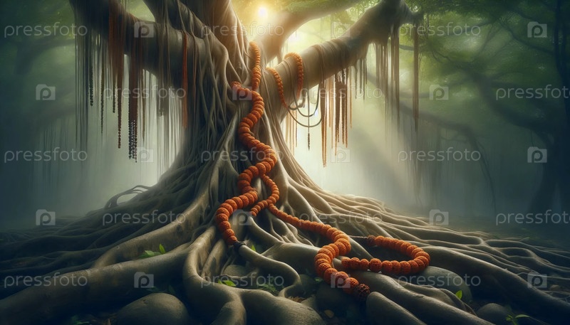 Банианское дерево с висящими бусинками Рудракши, Ai generated image