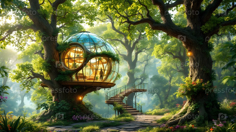Стеклянный дом на дереве в лесу, изображение создано с помощью Ai