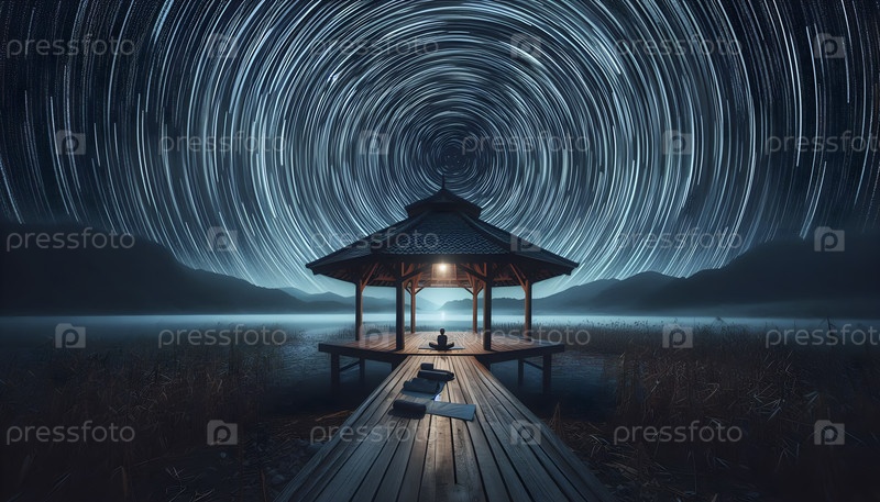Time-lapse концепция звездных троп над пустынной платформой йоги, Ai created image