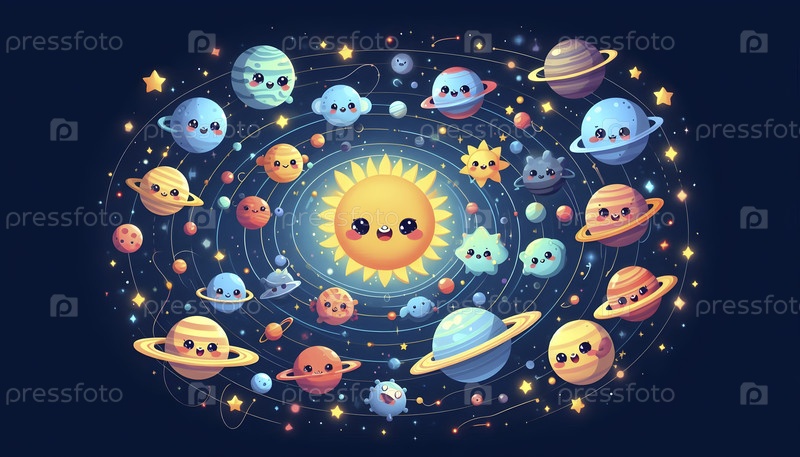 Обои для детской комнаты Солнечной системы с милыми планетарными персонажами, Ai created image