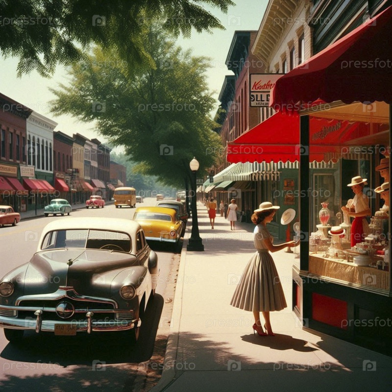Живая сцена на главной улице США, с парой модных витрин 1950-х годов для покупок под полосатыми тентами, Ai generated image