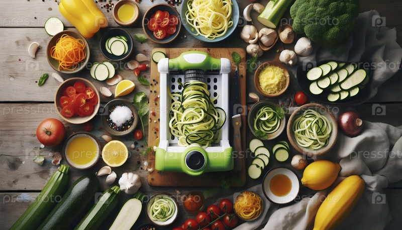 Над головой фотография красочного овощного спирализатора, создающего лапшу из цуккини, Ai created image