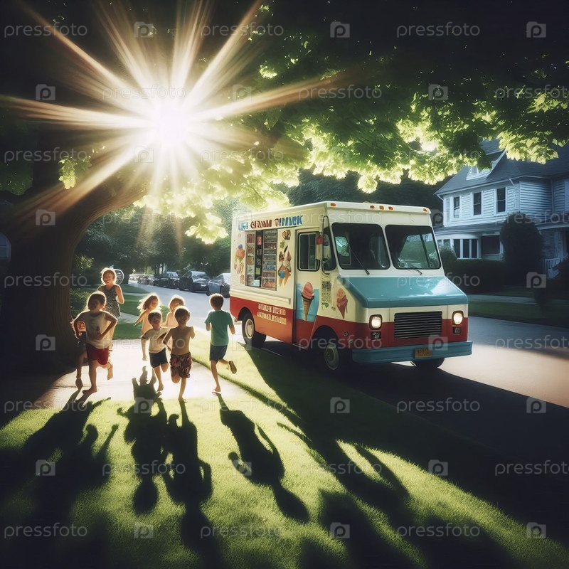 Ежедневная летняя сцена детей, бегущих к грузовику с мороженым на деревянной улице, Ai generated image