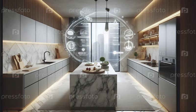 Минималистическая умная кухня с голографическими проекциями рецептов, Ai created image
