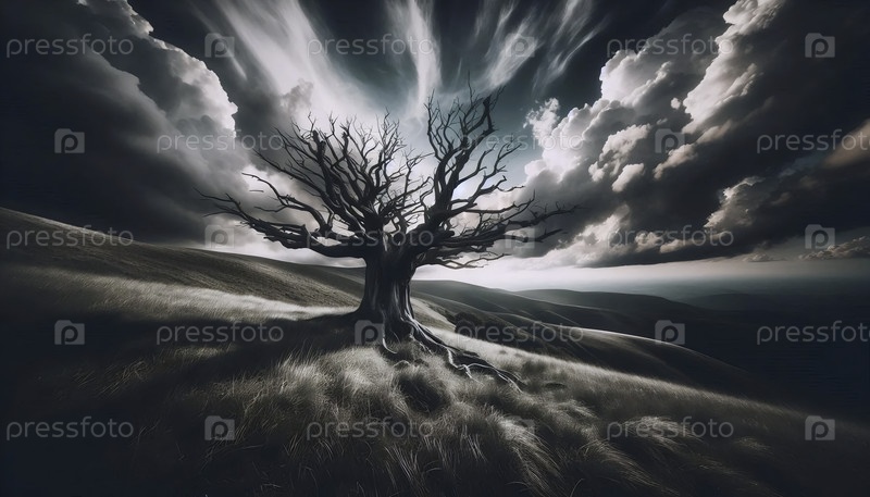 Меланхолический пейзаж одного узкого дерева на холме под бурным, драматическим небом Ай создал изображение