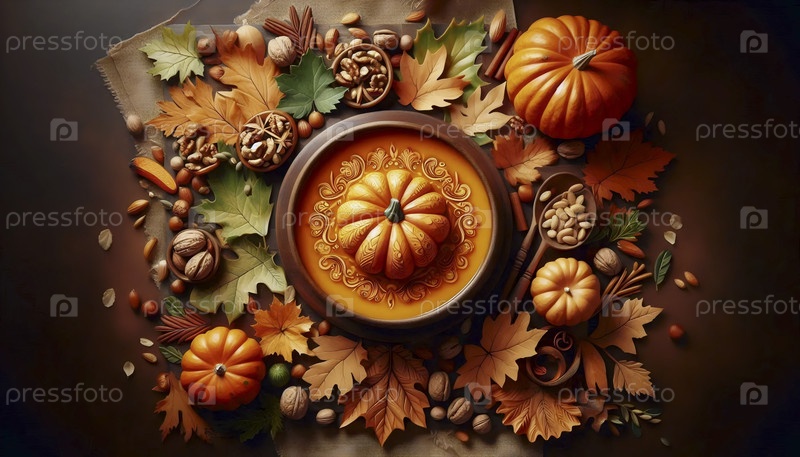 Сезонное осеннее кулинарное искусство с миской для тыквенного супа, окруженной резанными овощными листьями и жареными орехами, Ai created image