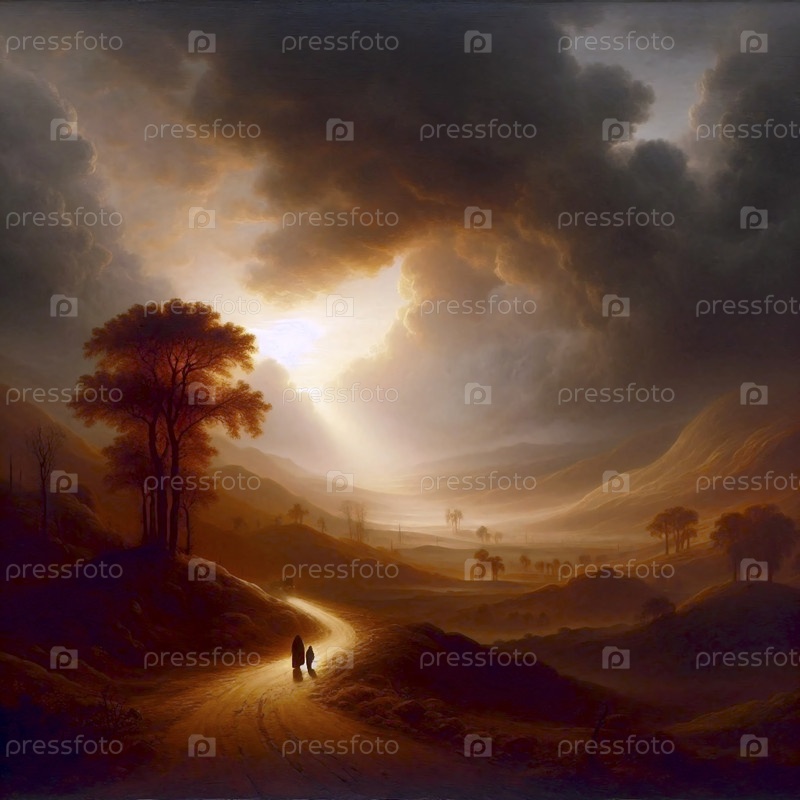 Дорога в Эммаус на закате, романтическая живопись, Ai generated image