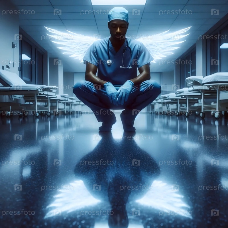 Усталая медсестра с полупрозрачными ангелскими крыльями в коридоре больницы, Ai generated image