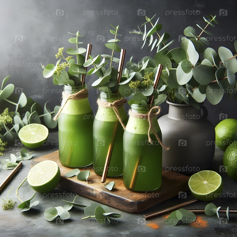 Органические зеленые детоксикационные соки в переработанных бутылках со стержнями из нержавеющей стали, Ai created image