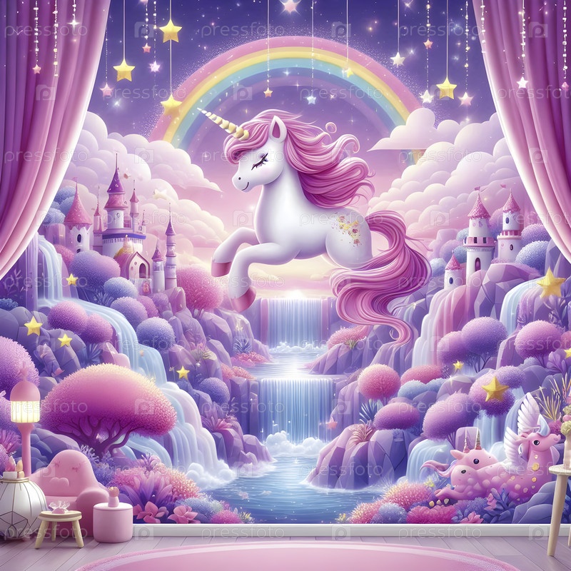 Magical unicorn kingdom детская комната обои с радужными водопадами и блестящей звездой , Ai created image