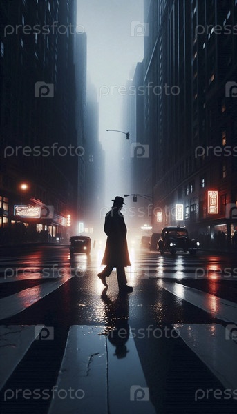 Одинокая фигура, пересекающая пролитый дождем перекресток в Нью-Йорке 1970-х годов, Ai generated image