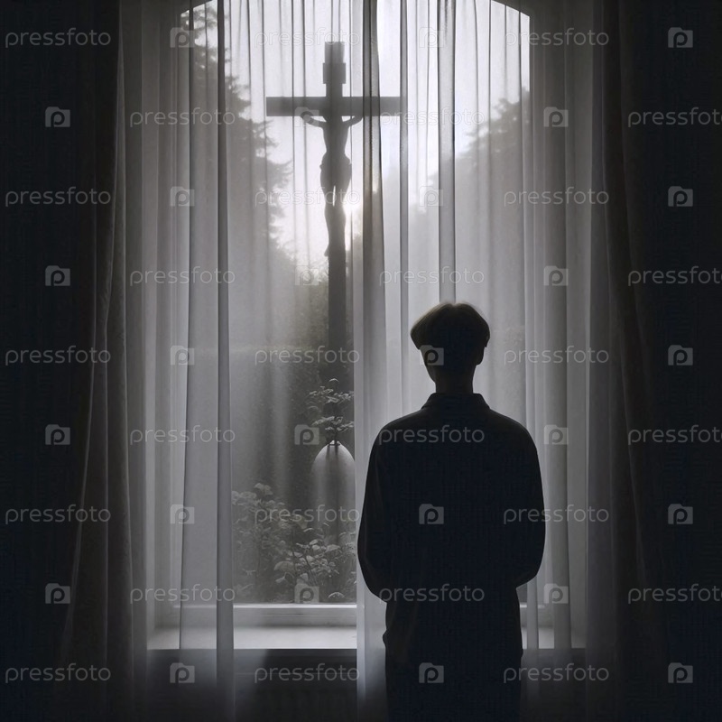 Силуэт распятия, увиденный через простую завесу с фигурой, Ай создал изображение