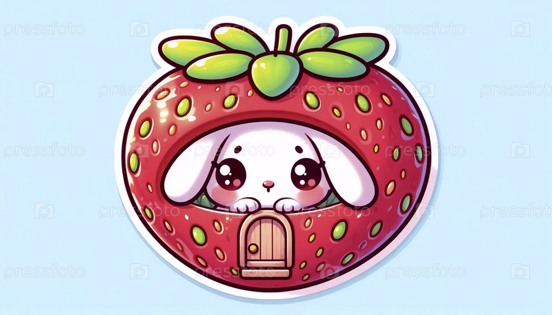 Милый стикер кавайи с кроликом в клубничном доме, Ai generated image