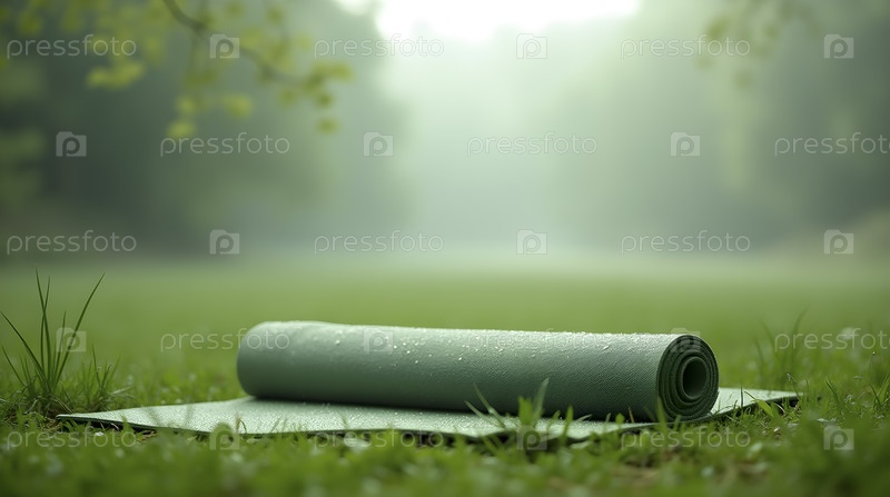 Матка для йоги развернута на росовой траве, Ai generated image