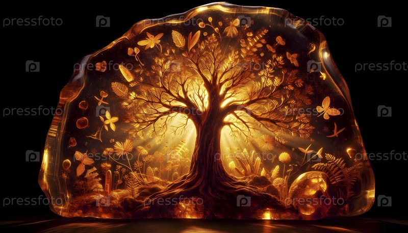 Дерево Жизни выгравировано в плиту из сырого янтаря, Ai created image