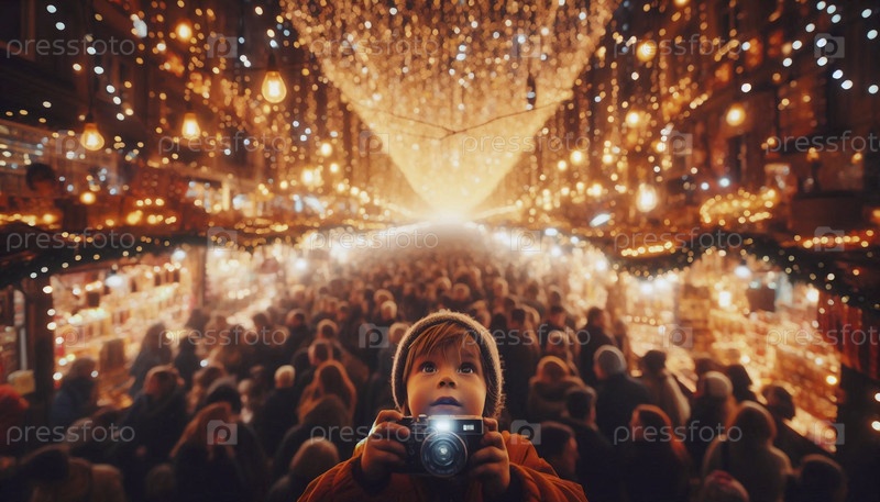 Широкий возвышенный вид оживленного европейского рождественского рынка на закате, сфокусированный на пораженных лицах детей, когда они смотрят на блестящее дерево, Ai создал изображение