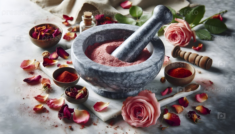 Молотком и пистолетом, измельчая сушеные листья роз в порошок, Ai created image
